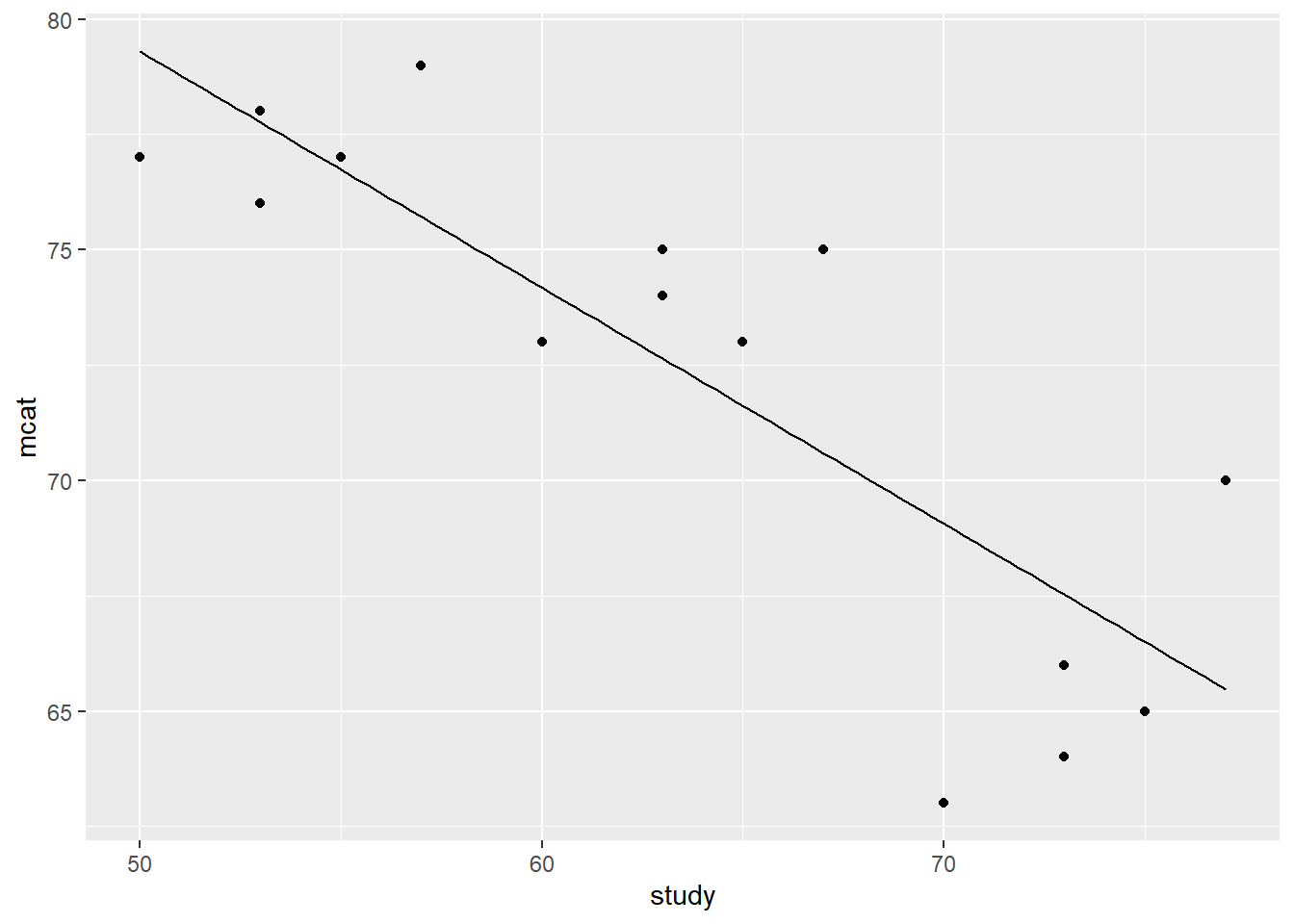 As you can see from the scatterplot, there appears to be a negative trend between mcat and study. In the following section, we will fit a regression line to this data to confirm this.