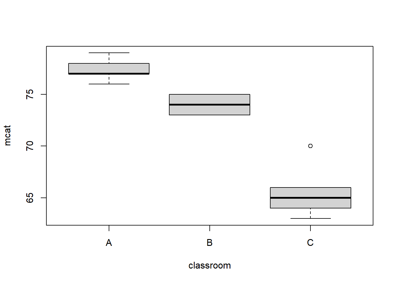 Another way we can quickly inspect this data is to look at a boxplot in which the dependent variable—MCAT score percentile—is separated by classroom: