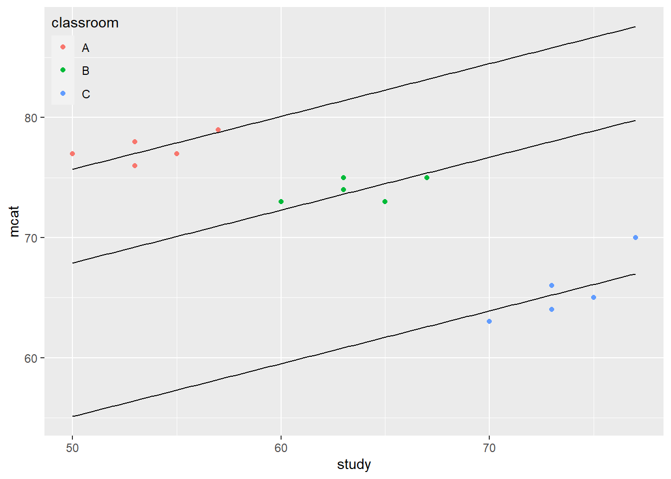 We can once again visualize this result. This time, we take the same scatterplot we used above—including the color coding for each classroom—and we add in three lines corresponding to the regression equations for each classroom.