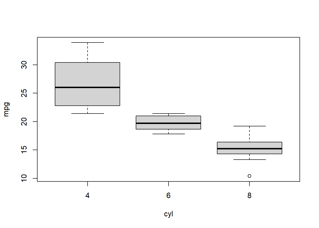 We always put the dependent variable on the y-axis (the vertical axis) and the independent variable on the x-axis (the horizontal axis). Clearly, this plot suggests that there is a noteworthy relationship between mpg and cyl.