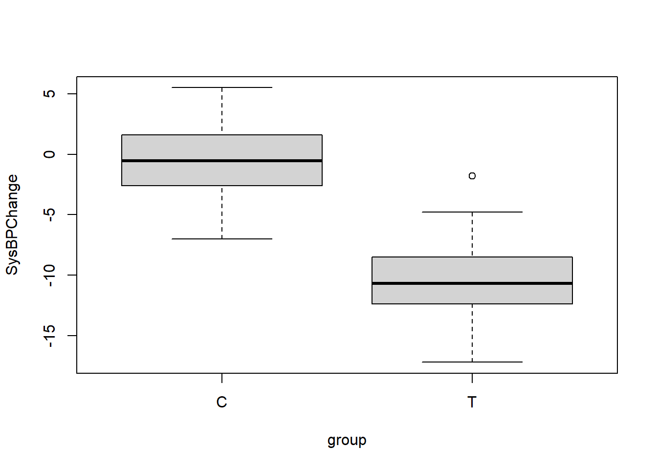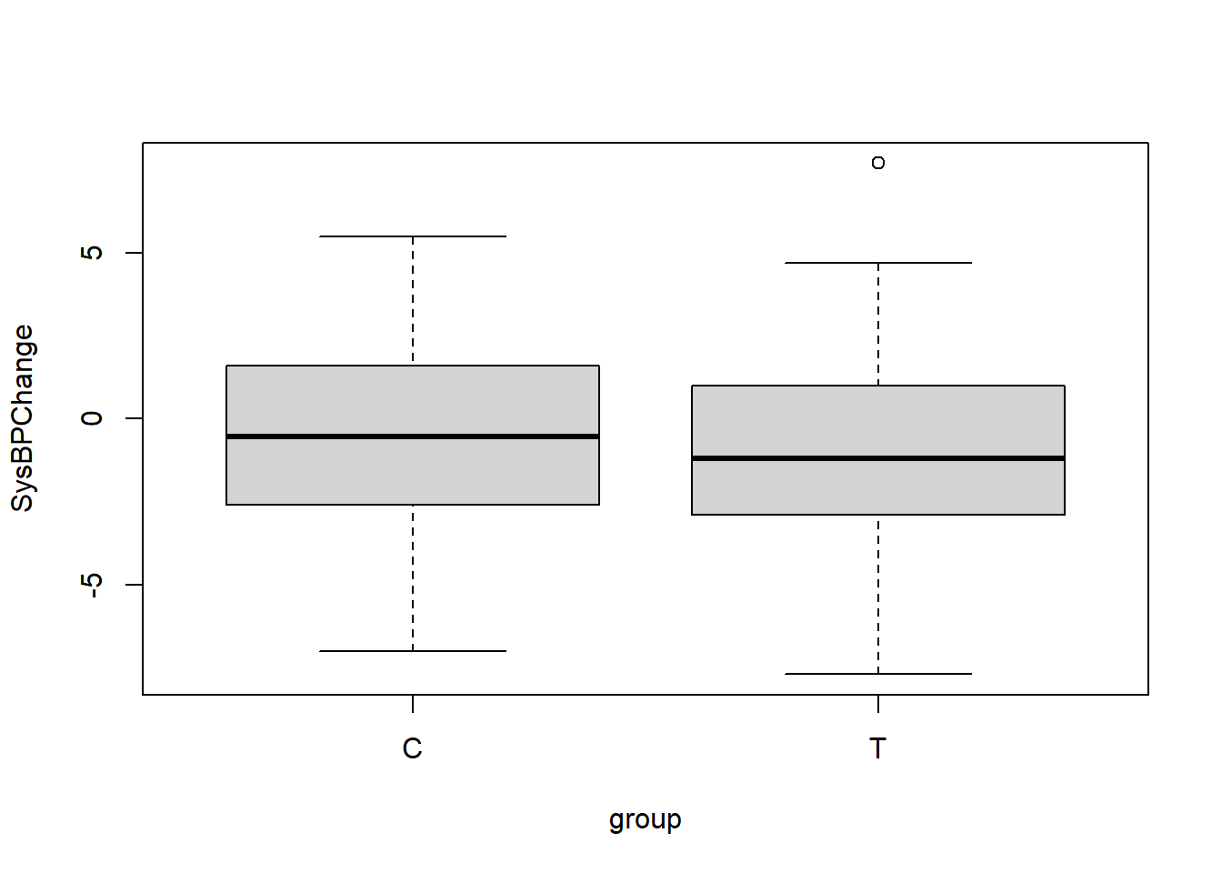 Null hypothesis (\(H_0\)): The change in blood pressure in the treatment group will be equal to the change in blood pressure in the control group, in our population of interest.