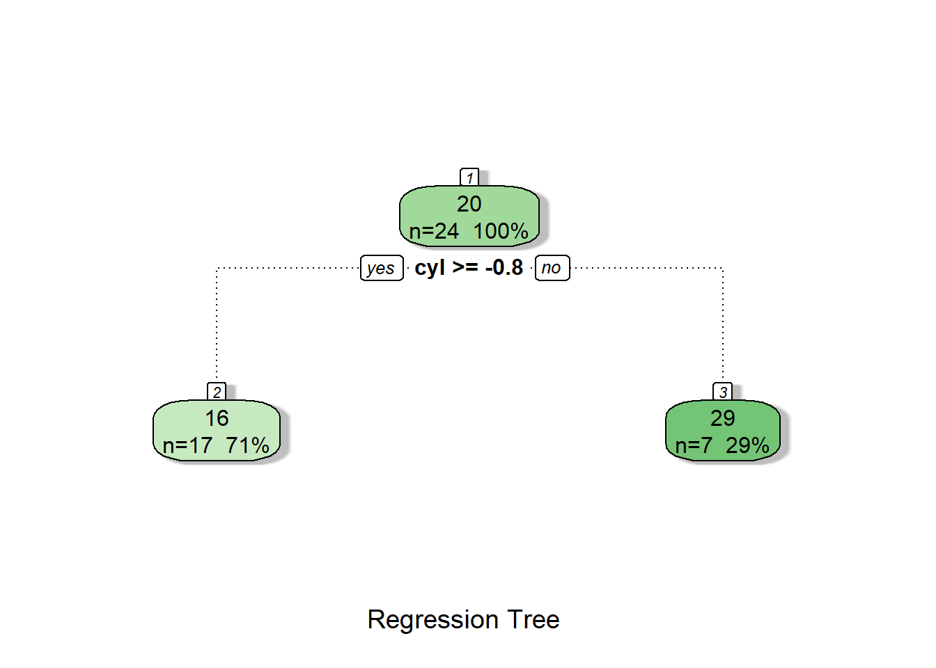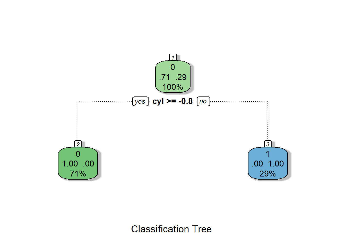 dtest.y.results.classification$high.mpg.prob <- attr(pred.a, "prob")↩︎Sometimes the computer might not be able to make a tree for you. In this case, you might need to adjust some more settings in the