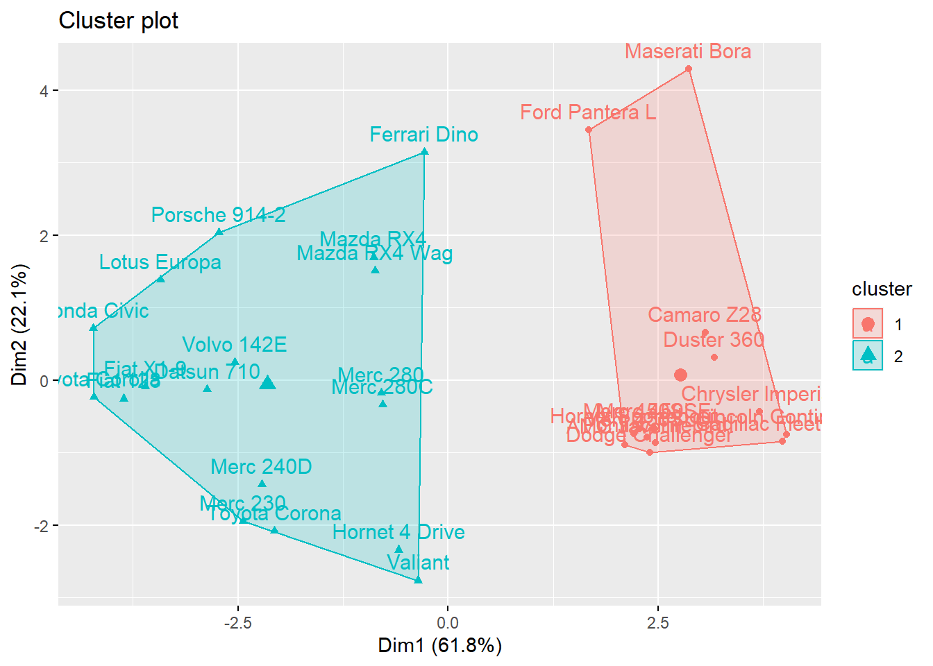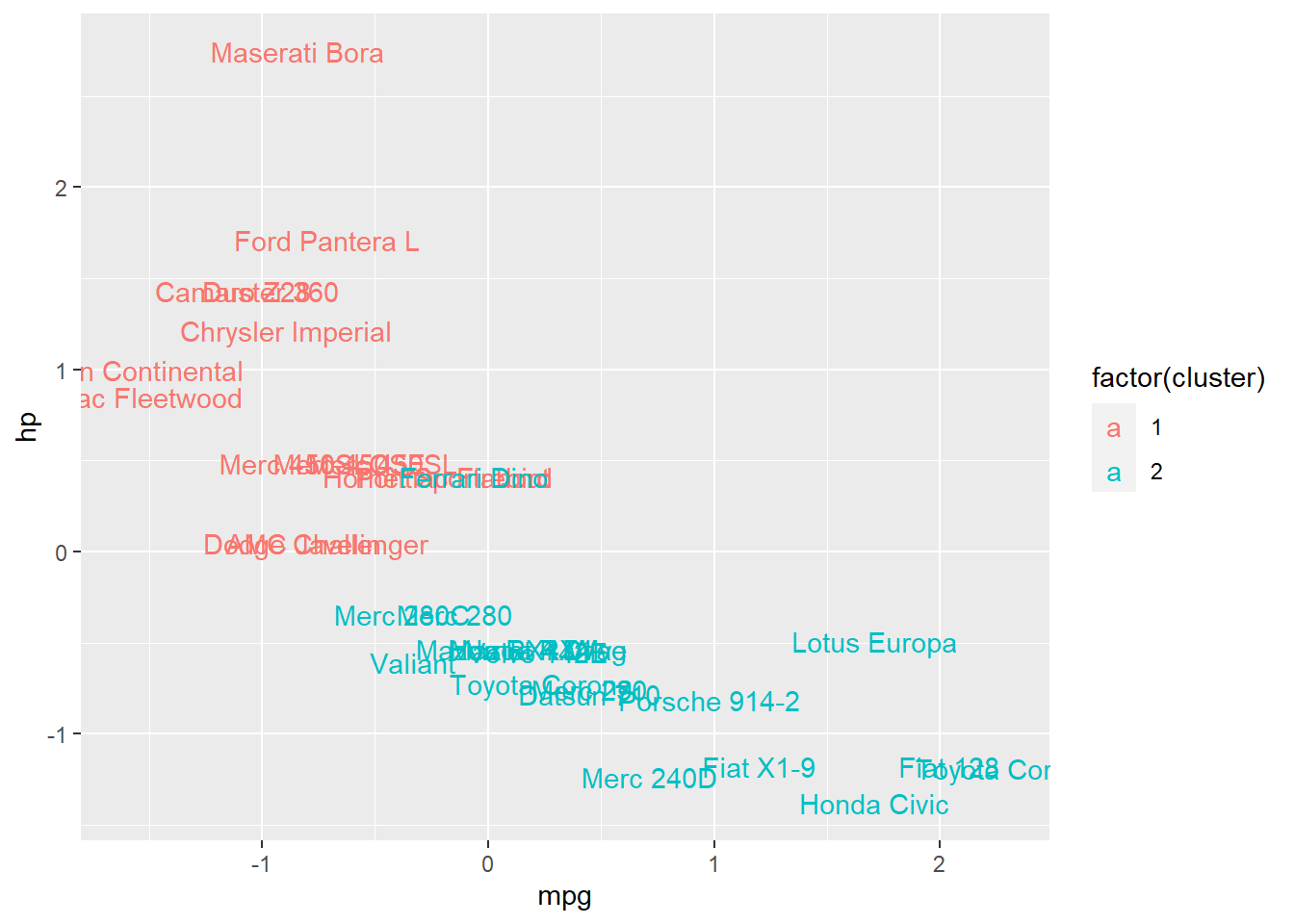 Above, we see at least a hint of some noteworthy patterns. Out of the 13 cars that have am coded as 126—meaning that they have manual transmission—11 of these cars belong to cluster 1 and only 2 of these cars belong to cluster 2. Cars with automatic transmission are more evenly spread out between the two clusters that were created.