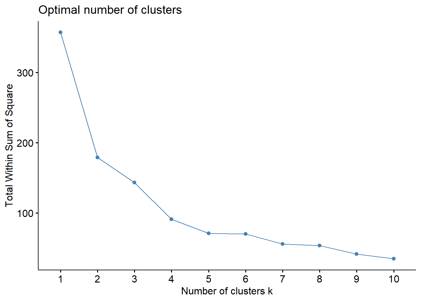 You can see that when we get down to about four clusters, we are really not reducing the WSS much at all with each additional cluster we add. Four clusters might be optimal. You could also argue that 4 isn’t much better than 3, and 3 isn’t much better than 2! Two clusters might possibly be appropriate for this dataset.