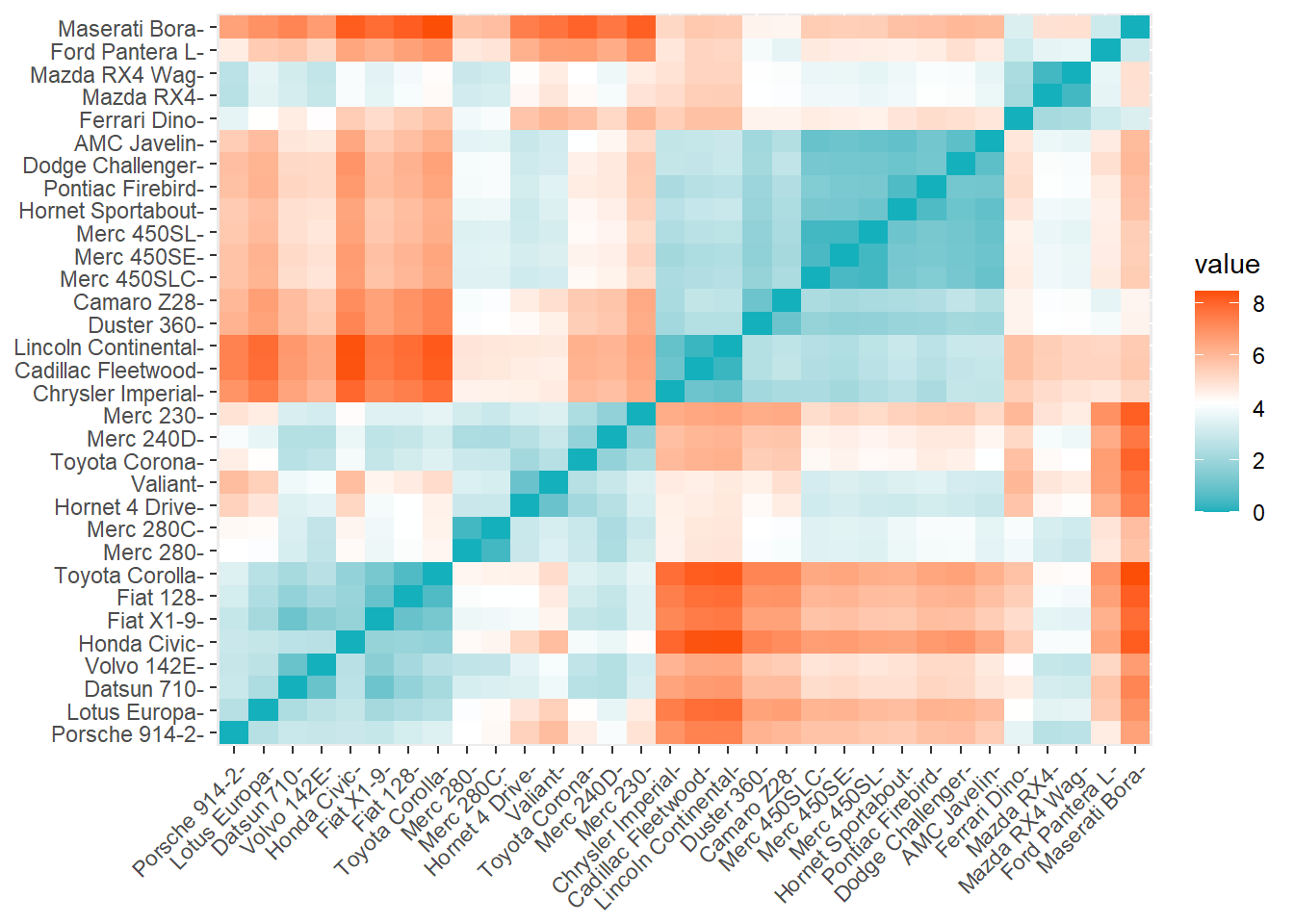 In the hot air balloons, it is intuitive that we could calculate distances between items. But now imagine that you have a dataset like the mtcars dataset, which we prepared and inspected earlier in this chapter. Each row is a car and each column is an attribute that a car might have. We can pretend that these attributes for the cars are just like location measurements for the hot air balloons. Even though these car attributes are not physical locations that we can visualize, we can still use the distance formula to calculate a “distance” between any two objects. And maybe those distances will tell us something noteworthy about the relationship (or similarity or difference) between those two objects.