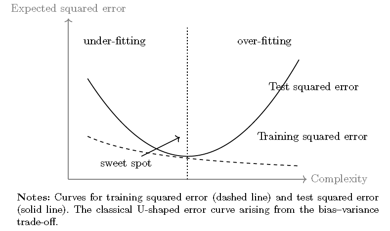 Thus, the ESE is composed of the squared bias, the variance of the prediction (which is a random variable due to data variation \(\mathcal{D}\)), and the irreducible error. The key insight is that increasing model complexity, such as by including more inputs, typically reduces bias but increases variance. This trade-off can lead to overfitting, where models perform well on the training data but poorly on new, unseen data. There is, therefore, an optimal point at which the predictive error is minimized (see the next Figure).69
