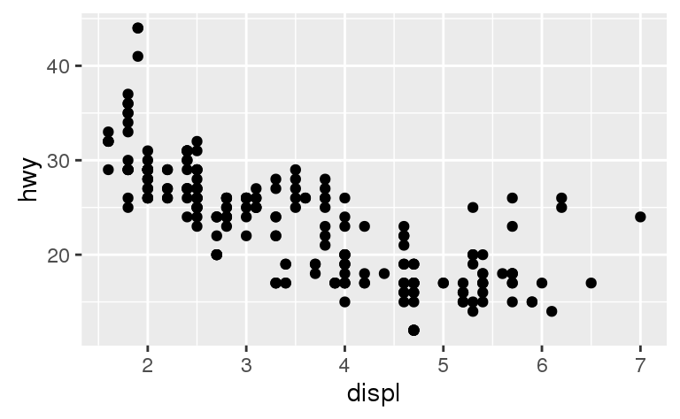 ggplot(mpg, aes(displ, hwy)) + geom_point()