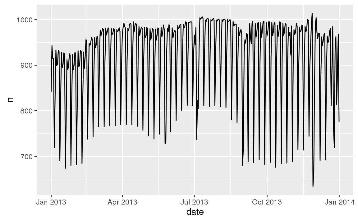 daily %>% filter(resid < -100) #> # A tibble: 11 × 4 #> date n wday resid #> <date> <int> <ord> <dbl> #> 1 2013-01-01 842 Tues -109 #> 2 2013-01-20 786 Sun -105 #> 3 2013-05-26 729 Sun -162 #> 4 2013-07-04 737 Thurs -229 #> 5 2013-07-05 822 Fri -145 #> 6 2013-09-01 718 Sun -173 #> # ... with 5 more rowsIf you’re familiar with American public holidays, you might spot New Year’s day, July 4th, Thanksgiving and Christmas. There are some others that don’t seem to correspond to public holidays. You’ll work on those in one of the exercises.