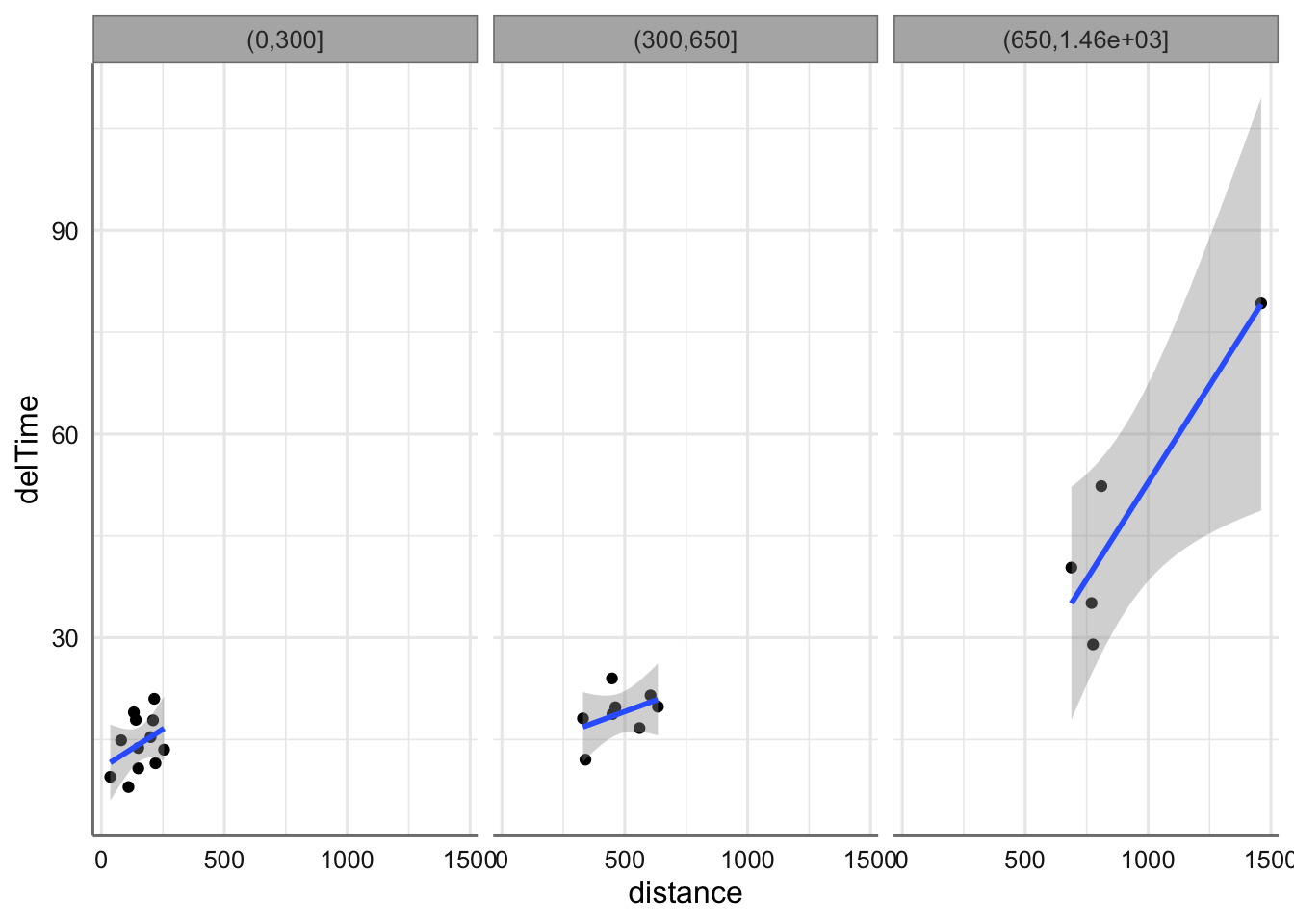 Podemos probar aún otra modelización alternativa. Volvemos al descriptivo y podríamos marcar tres zonas de comportamiento para la relación distance-delTime; esto nos llevaría a categorizar la variable distance en tres niveles y modelizar cada zona por separado en base a la información disponible