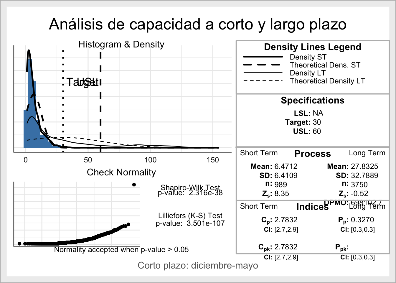 Un análisis de capacidad a largo plazo y también a corto plazo durante una franja de tiempo determinada y más reducida, lo podríamos realizar directamente con la librería SixSigma: