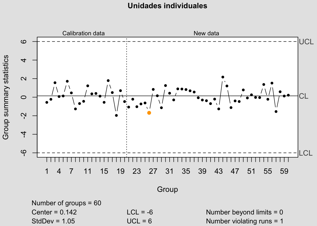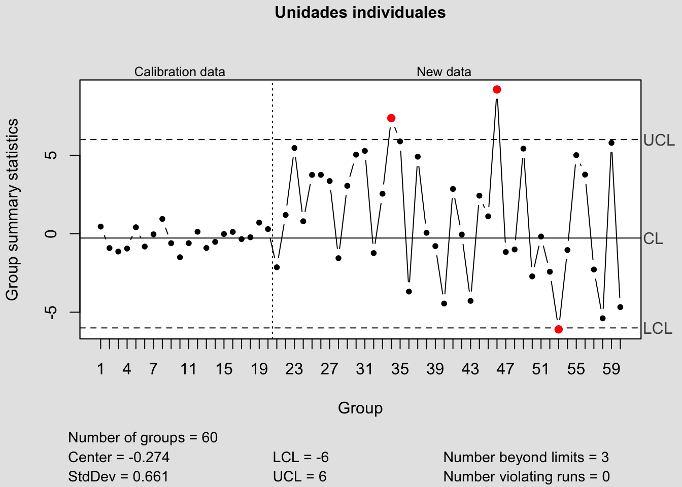 Por ejemplo, en el caso de valores individualizados, la línea central se calcula con la media \(\bar{x}\) de todas las observaciones y los límites de control con \(\bar{x}\pm 3 \bar{R}/d_2\), donde \(\bar{R}\) es el recorrido (rango) medio entre observaciones consecutivas, y \(d_2\) es una de las constantes de Shewhart.