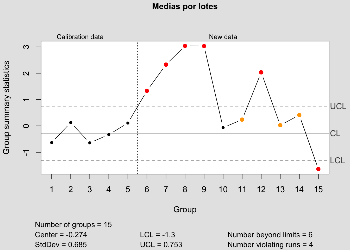 qccproporciona gráficos de control basados en la regla de las 3sigmas de Shewhart. La libreríaggQCproporciona gráficos de violaciones a las reglas de Western Electric. Por último, la libreríaqicharts2da las desviaciones respecto de las reglas de Anhøj.