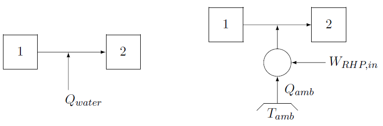 \[\therefore Q_{amb} = T_{amb}\thinspace \Delta S_{water}= 288.15\times 121.4 = 34990kJ\] From an energy balance around the heat pump (the amount of heat required to raise the temperature of the water remains the same): \[W_{RHP,in} =Q_{water}-Q_{amb} = 2666 kJ\] This work is supplied by the electric motor driving the compressor.