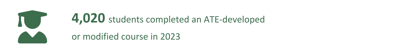 A total of 105 academic degree programs were developed or substantially modified by 64 ATE projects in 2023. Most of these programs awarded certificates (61%) or associate degrees (31%). Three programs awarded bachelor’s degrees, and 5 programs provided other types of credentials. 6,520 students attended at least one course in these academic programs, with a total of 900 completing a program in 2020; 400 students completed an associate degree program, while 360 students completed a certificate program. Programs with students completing certifications or degrees in 2023 graduated an average of 20 students.