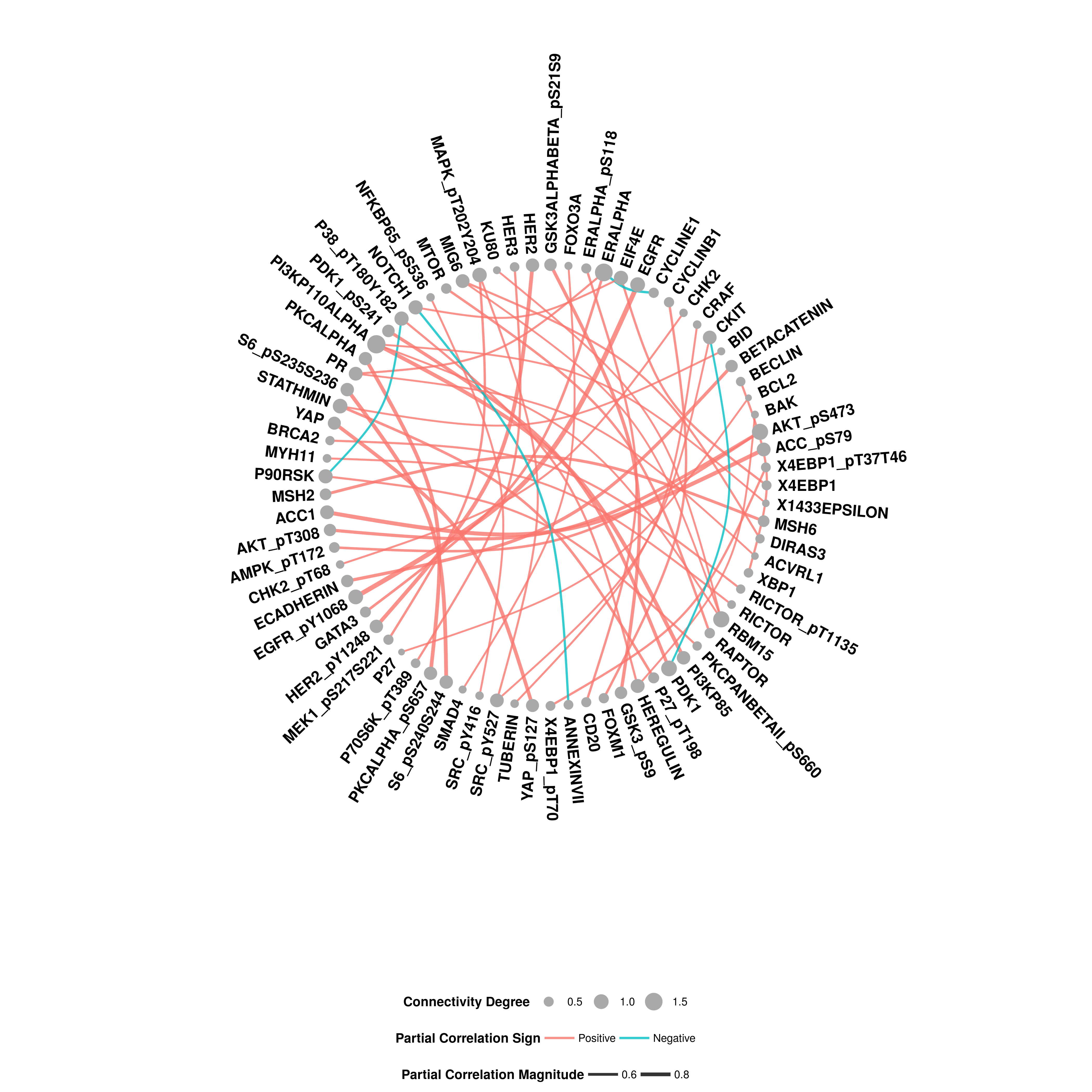 The output provides a circular network plot. Node sizes represent connectivity degrees of the corresponding features while edge widths are proportional to the partial correlation between two features. Sign of the partial correlations are represented by the color