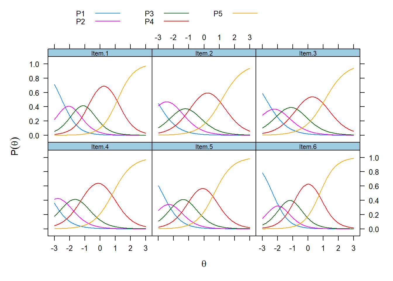 Each symmetrical curve represents the probability of endorsing a response category (P1 = ‘Strongly disagree,’ P2 = ‘Disagree”, P3 = “Can’t decide,” P4 = “Agree,” and P5 = "Strongly agree). These curves have a functional relationship with theta; As theta increases, the probability of endorsing a category increases and then decreases as responses transition to the next higher category. The CRCs indicate that the response categories cover a wide range of theta.