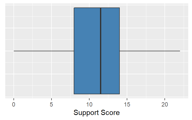 geom_boxplot(mapping = aes(x = family, y = support ), fill="steelblue") +