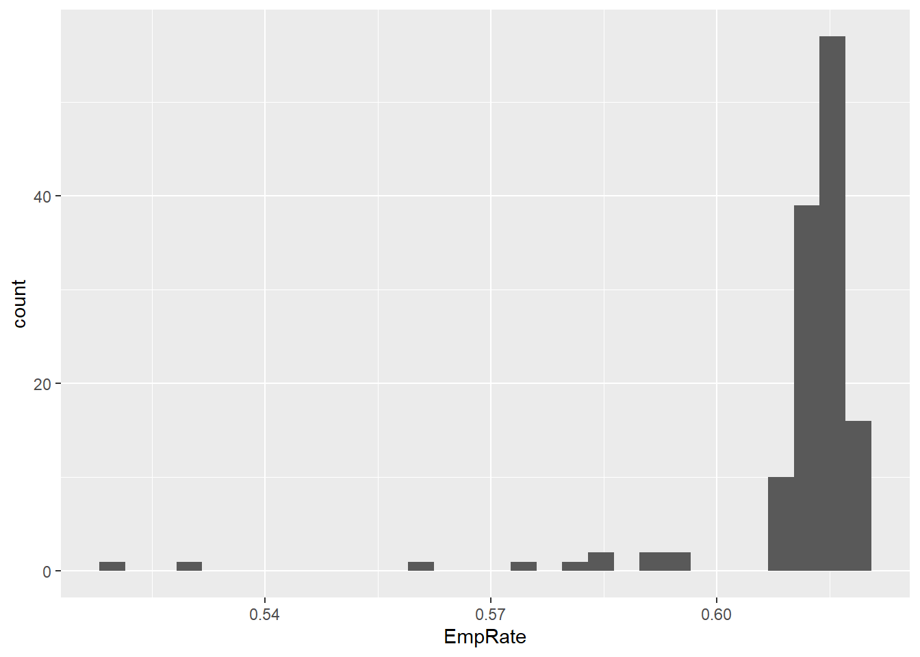 ggplot(data = PPData, mapping = aes(x = EmpRate)) + geom_histogram()