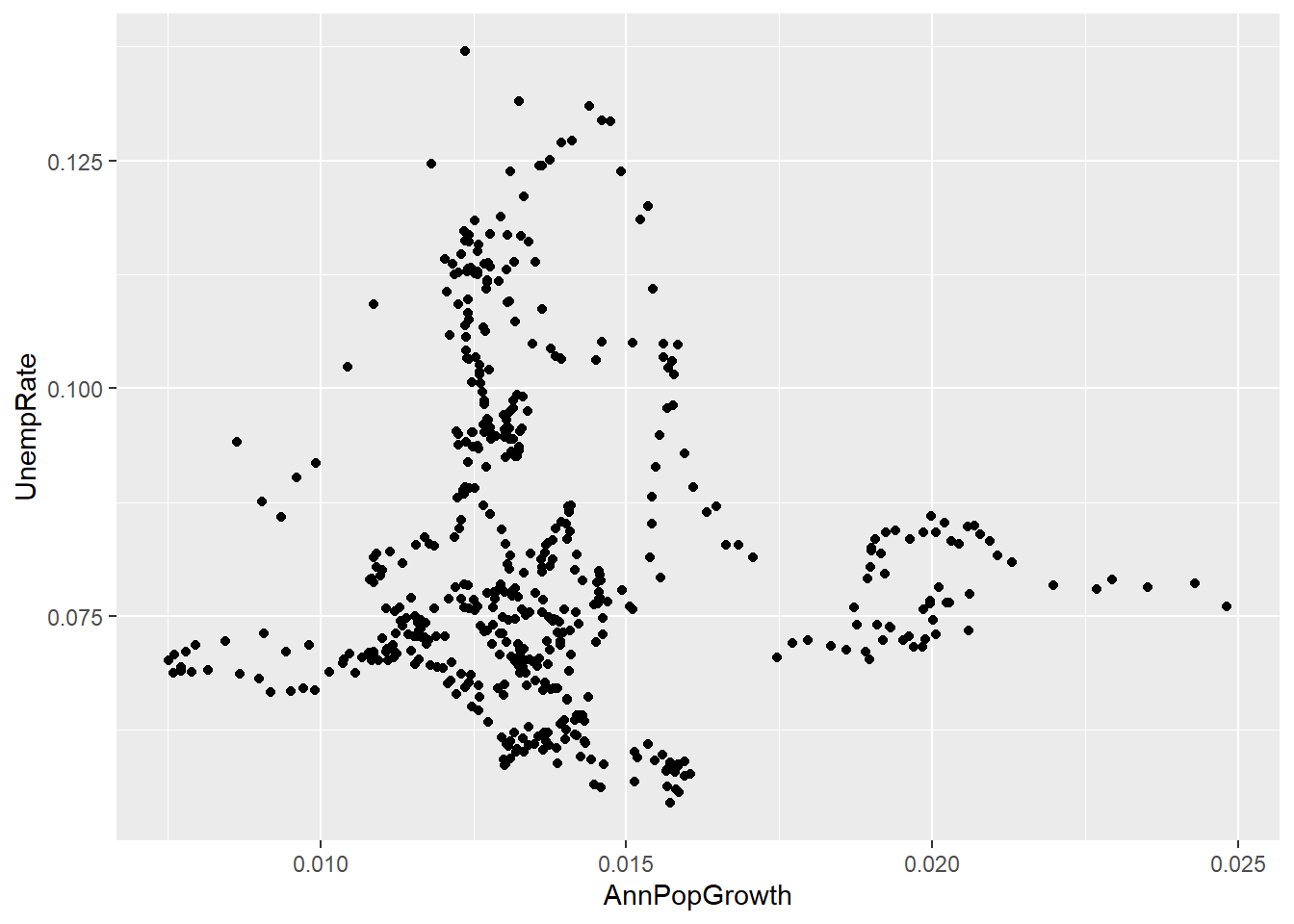 ggplot(data = EmpData, mapping = aes(x = AnnPopGrowth, y = UnempRate)) + geom_point() +