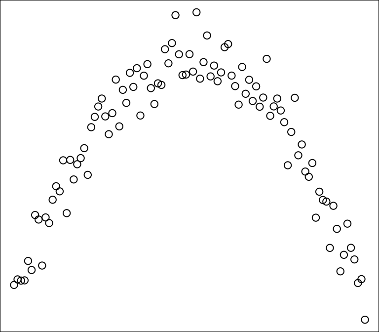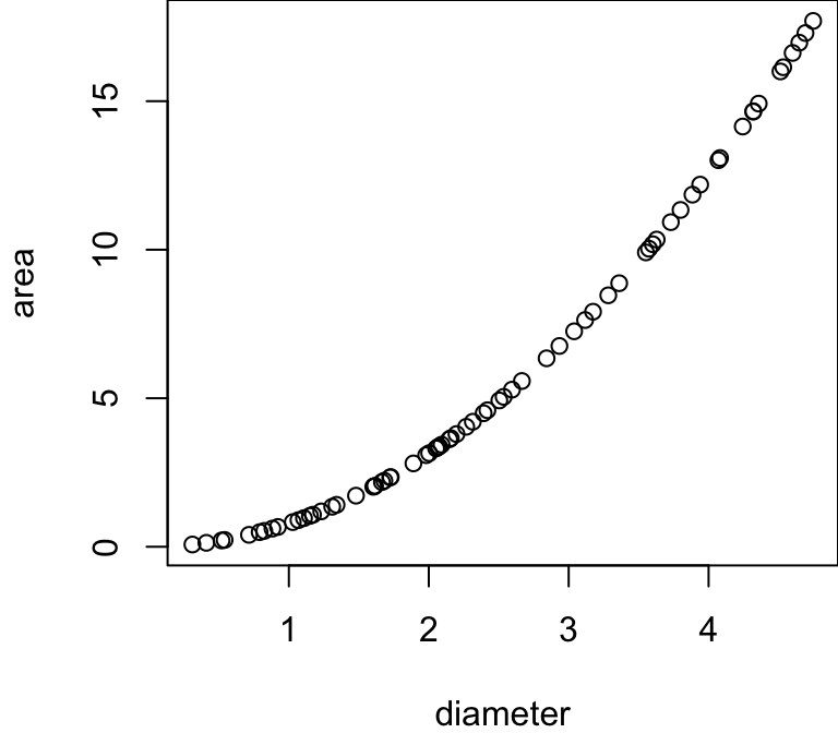 Question 8.7 A circle of diameter d has area \(\frac{1}{4}\pi d^2\). We plot a scatter diagram of area against diameter for a sample of circles.