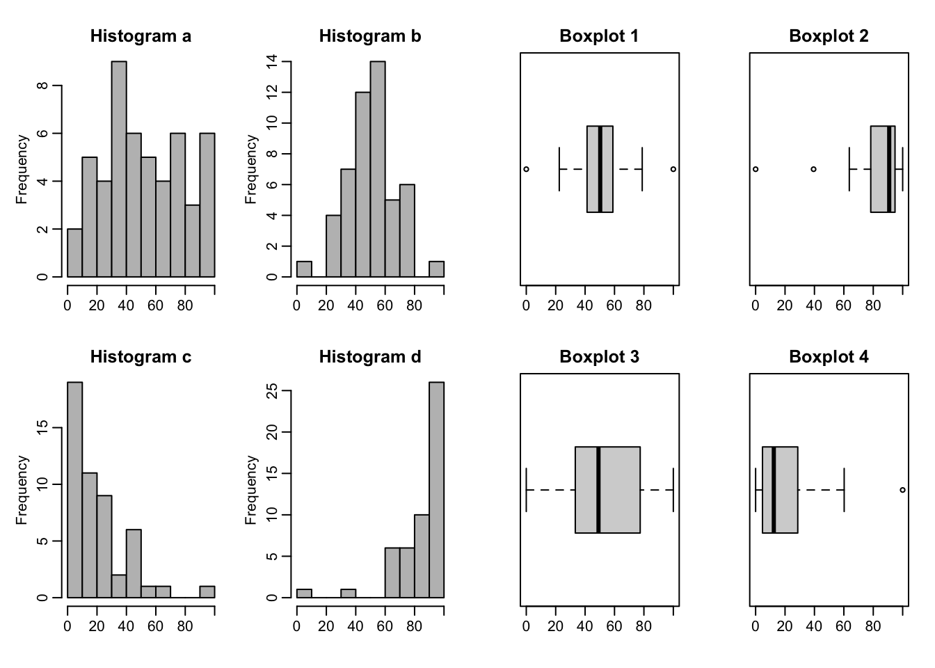 Question 4.4 Match the boxplots to the corresponding histograms: