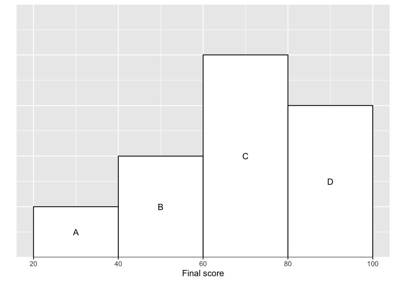 Exercise 2.3 (Freedman, Pisani, and Purves 2007) The histogram below shows the distribution of final exam scores in a certain statistics class.