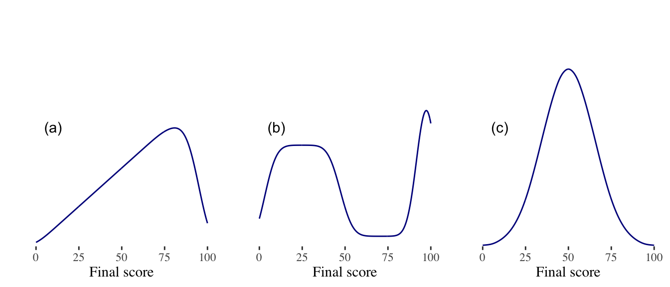 Exercise 2.4 (Freedman, Pisani, and Purves 2007) Below are sketches of histograms (or kernel density plots) for test scores in three different classes. The scores range from 0 to 100; a passing threshold was 50. For each class, was the percent who passed about 50%, well over 50%, or well under 50%?