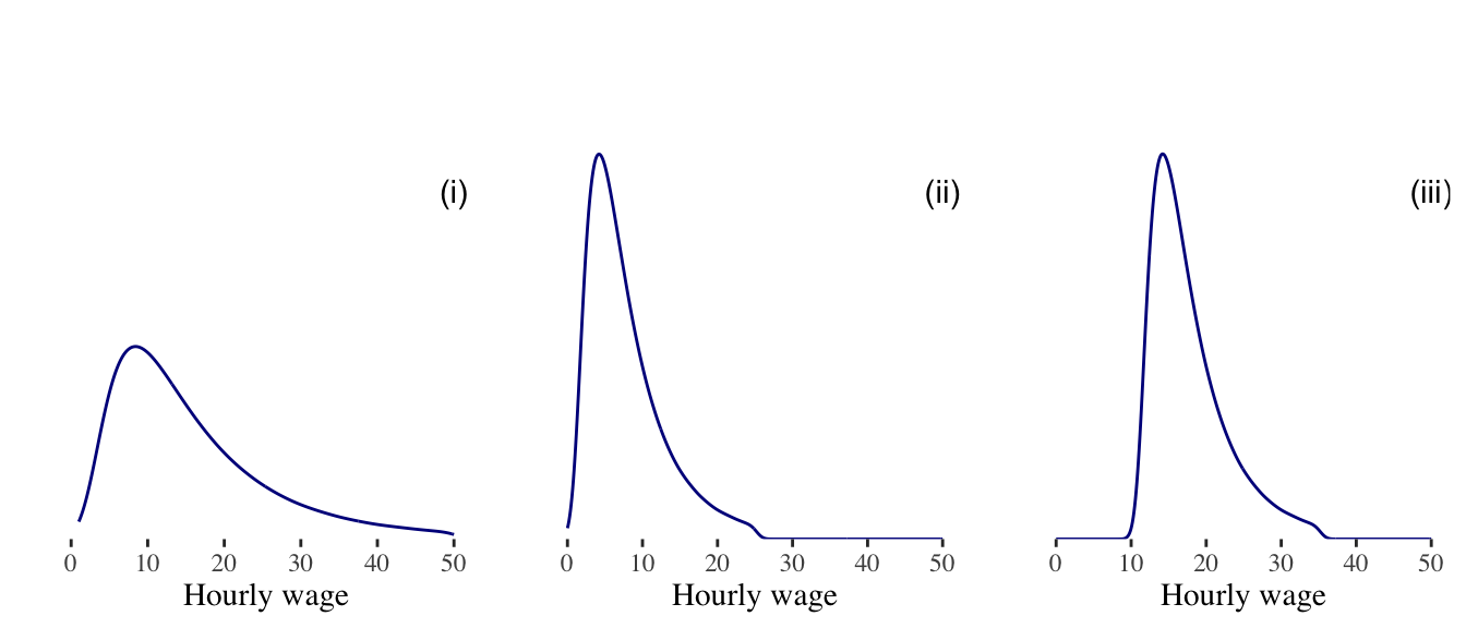 Exercise 2.5 (Freedman, Pisani, and Purves 2007) An investigator collects data on hourly wage rates for three groups of people. Those in group B earn about twice as much as those in group A. Those in group C earn about $10 an hour more that those in group A. Which kernel density plot belongs to which group? (The plots do not show wages above $50 an hour.)