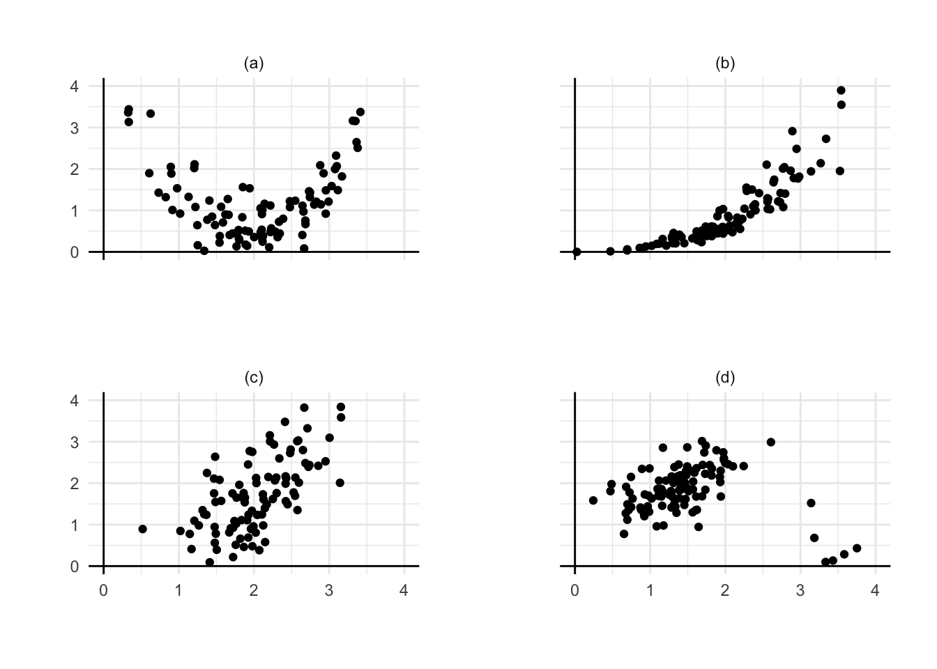 Question 9.1 Among the four plots, choose the one where a simple linear model would be most reasonable. For each of the remaining panels, describe the features that make simple regression less suitable. Discuss what could be done to address these issues in each case.