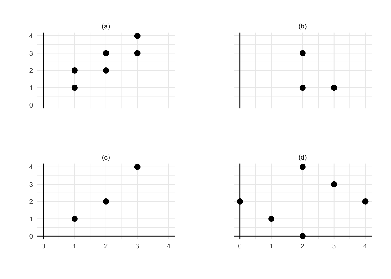 Question 9.4 In each panel, manually sketch an approximate least-squares regression line based on the displayed data.