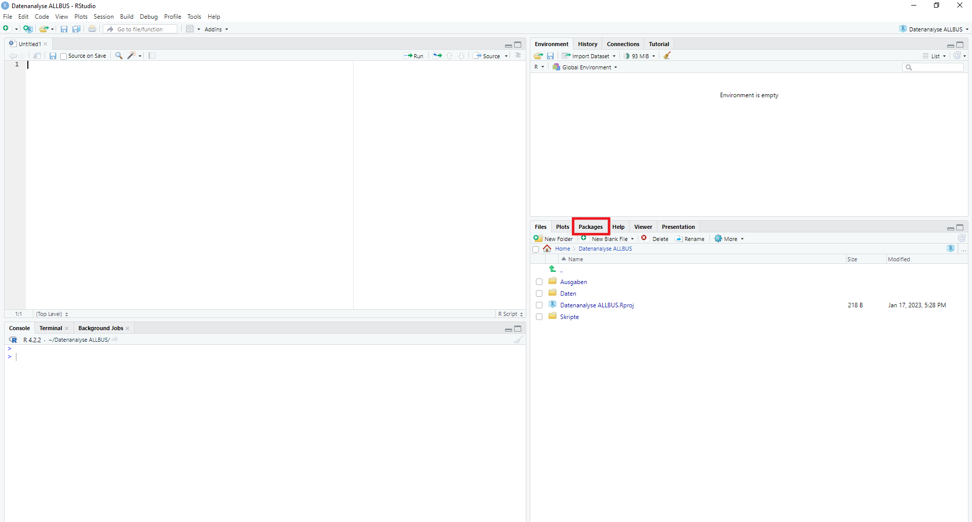 Du hast zwei Möglichkeiten ein neues Paket zu installieren: Die schnellste und einfachste Variante funktioniert über einen Befehl, den Du in einem R-Script eingeben und dann ausführen kannst.