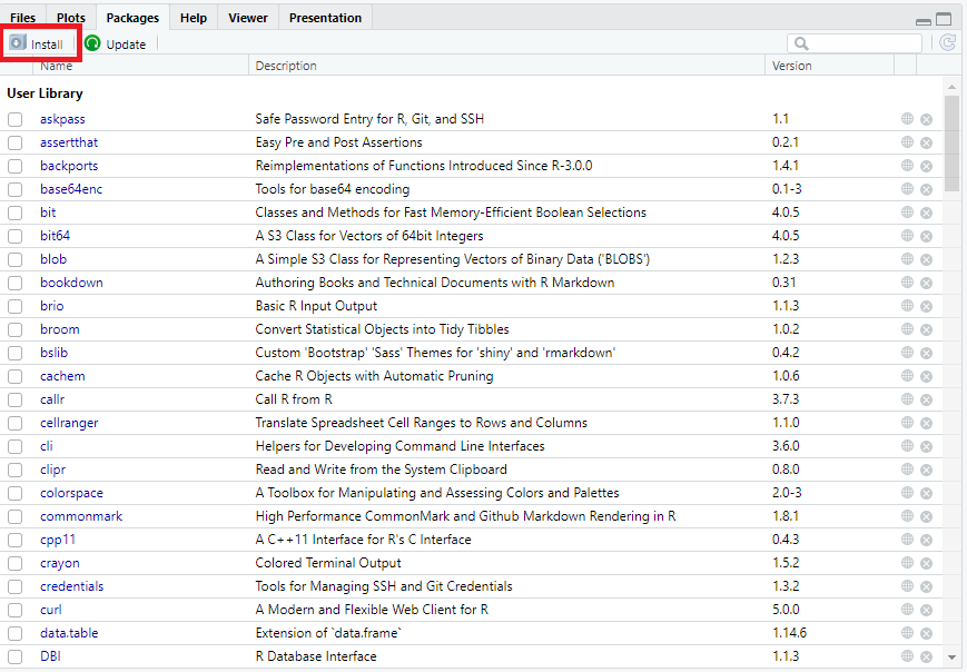 Alternativ kannst Du die benötigten Pakete auch über den [Packages]-Tab im unteren rechten Fenster in RStudio herunterladen. Dazu kannst Du wie folgt vorgehen: