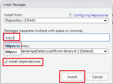 Optional kannst Du “Install dependencies” anklicken, um auch abhängige Pakete mit zu installieren. Die Einstellung “Install from: Repository (CRAN)” kann in aller Regel beibehalten werden.