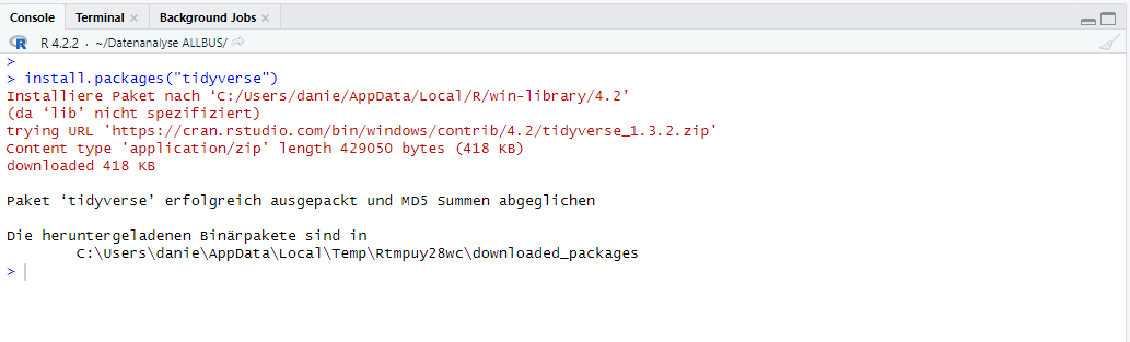 Hinweis: Bei der Installation eines Paketes mit dem Befehl install() muss der Name des Paketes in Anführungszeichen gesetzt werden. Wenn das Paket bereits installiert ist, dürfen zum Aktivieren mit dem Befehl library() keine Anführungszeichen verwendet werden.