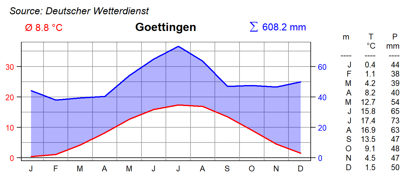 berryFunctions::climateGraph(temp, prec, main="Goettingen")