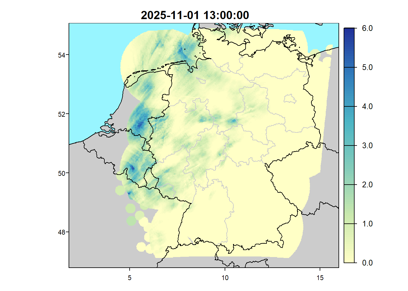 plotRadar(terra::rast(rw_orig$dat), extent="radolan", main=rw_orig$meta$date)