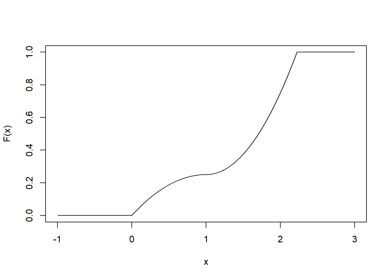 # b Fx <- Vectorize(function(x) { if (x < 0) return(0) if (x < 1) return(-1/4*x^2+1/2*x) if (x < 1 + (3/2)^0.5) return(1/2*x^2-x+3/4) return(1) }) plot(Fx, from = -1, to = 3, n = 10001, ylab = "F(x)")