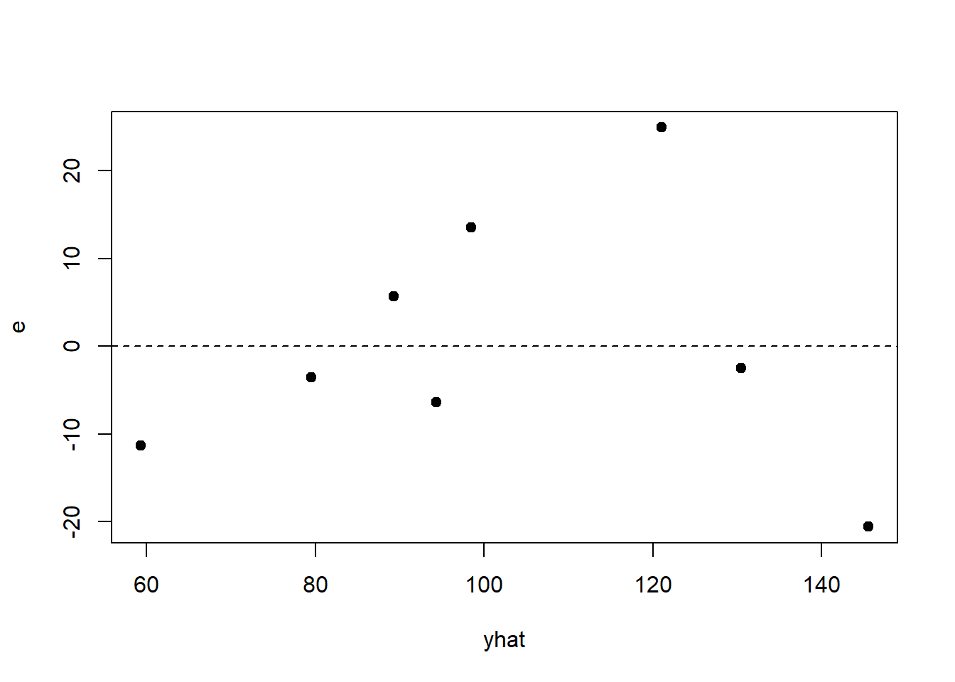 \(i\) \(X\) \(Y\) \(\hat{Y}\) \(E\) \(E^2\) 1 21.31 48 59.29 -11.29 127.58 2 30.17 95 89.26 5.74 32.89 3 32.89 112 98.47 13.53 183.18 4 46.81 125 145.55 -20.55 422.37 5 31.67 88 94.34 -6.34 40.18 6 39.57 146 121.06 24.94 621.92 7 42.35 128 130.47 -2.47 6.08 8 27.3 76 79.56 -3.56 12.65 Totale 272.07 818 818 0 1446.85