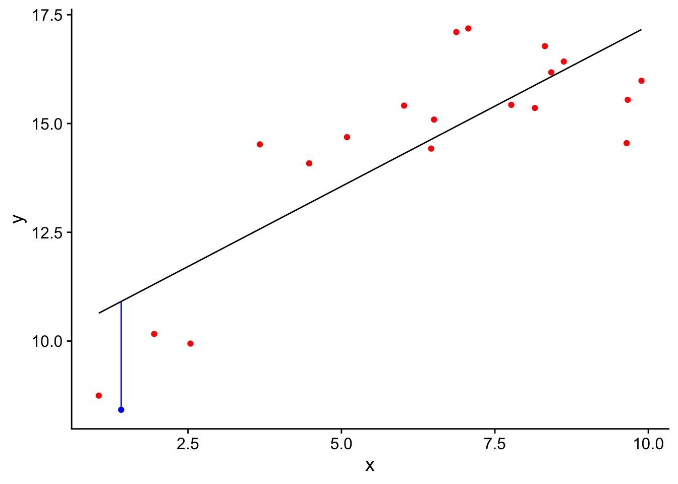 geom_segment(data=test,aes(x=x,xend=x,y=y,yend=pred),col='blue')+