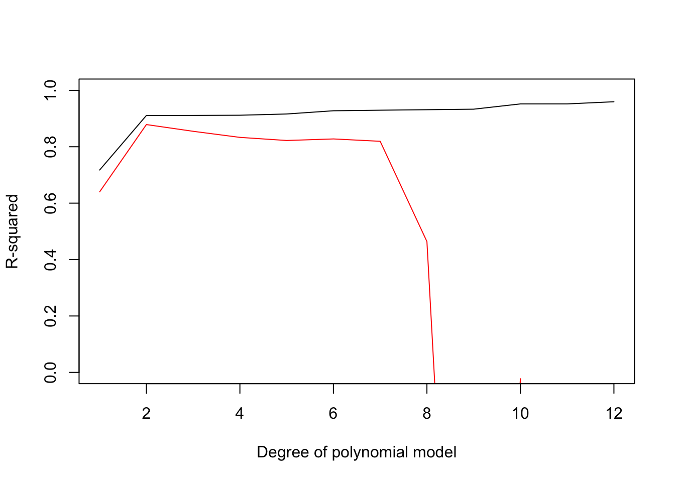 plot(1:12,Pred_R2,ylim=c(0,1),xlab="Degree of polynomial model",ylab="R-squared",col='red','l')