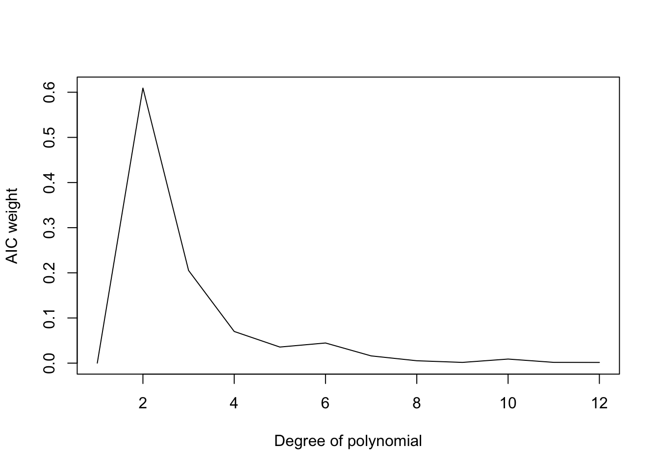 plot(1:12,dfAIC$AICweight,'l',ylab="AIC weight",xlab="Degree of polynomial")