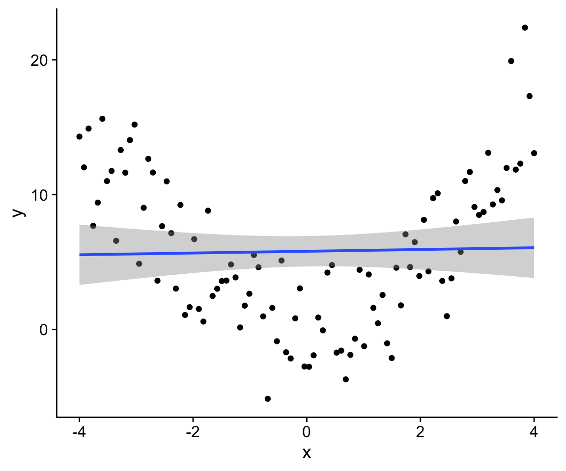 In this particular case, we might estimate the slope of the linear relationship to be very close to zero. In a way, this inference is still correct; however, at the same time, this statistical model doesn’t really capture the relationship between x and y. By fitting a more complex model, we can see that there is a relationship between x and y, it is just not linear.
