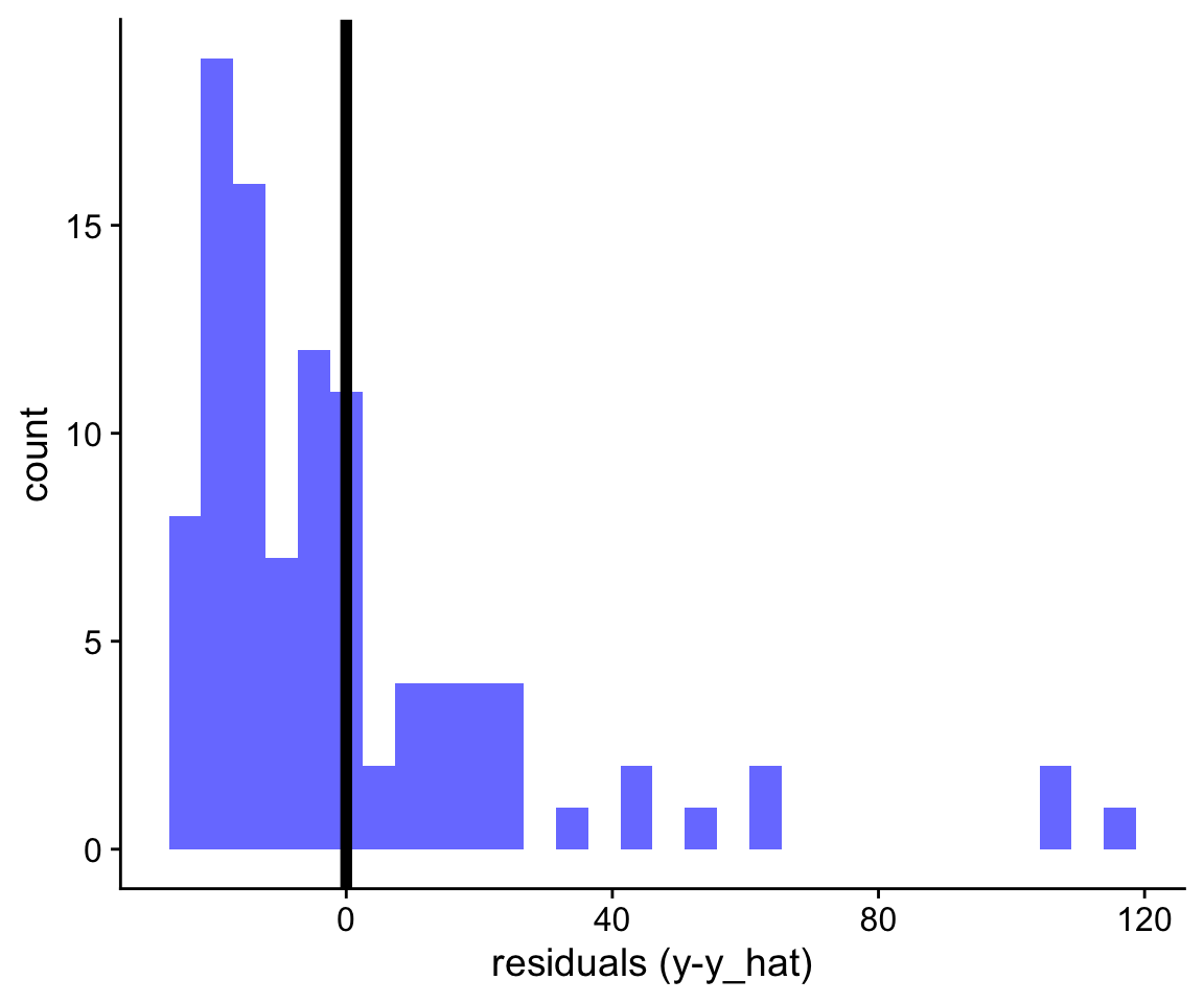 As we will see later in the course, even when residuals are clearly not normally distributed like in the example above, the statistical inferences are often still valid. However the main problem with the example above is that the means don’t really reflect an “average” or typical value because most observations have values below the mean. In cases like this, sometimes transforming the data, for example, using log(y) rather than y as the dependent variable allows the mean to better capture the central tendency of the data.