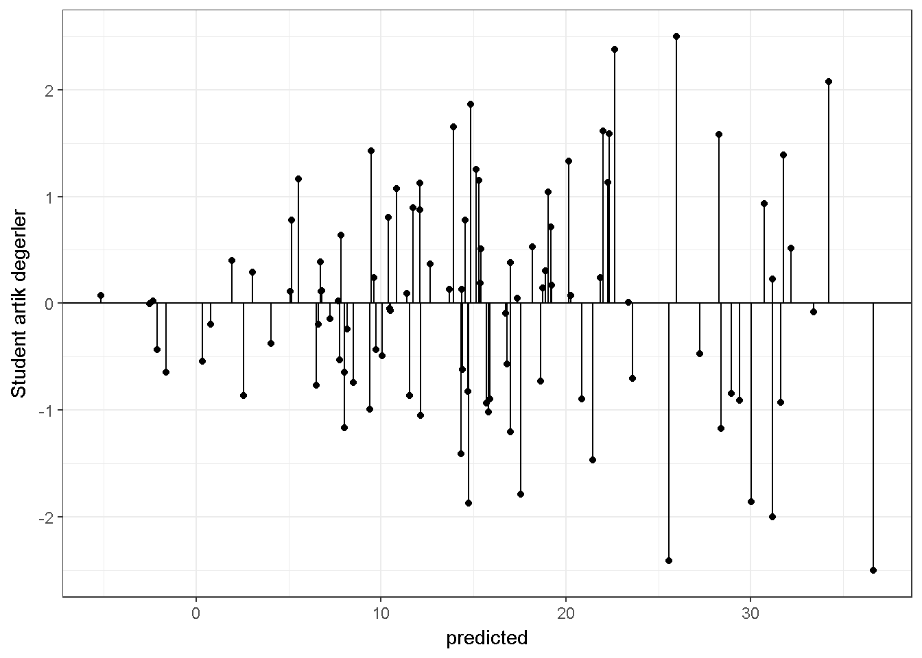• Student artıklar: Ham artıkların tahmin edilen standart hataya bölünmesi ile hesaplanır.