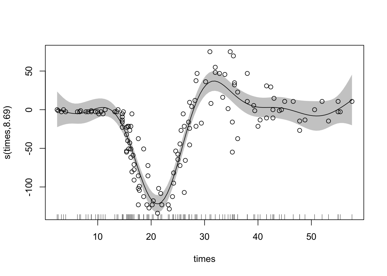 다음으로 비선형 모형인 일반화가법 모형에 적합시켜보자. GAM은 gam패키지 또는 mgcv패키지를 사용하여 적합시킬 수 있는데 몇가지 장점 때문에 mgcv패키지를 사용한다. 사용하는 방법은 먼저 패키지를 불러오고 선회회귀모형의 lm 대신 gam을 사용하며 설명변수인 times 를 직선이 아닌 곡선(smooth)을 사용하라는 의미로 s(times)를 사용하면 된다.