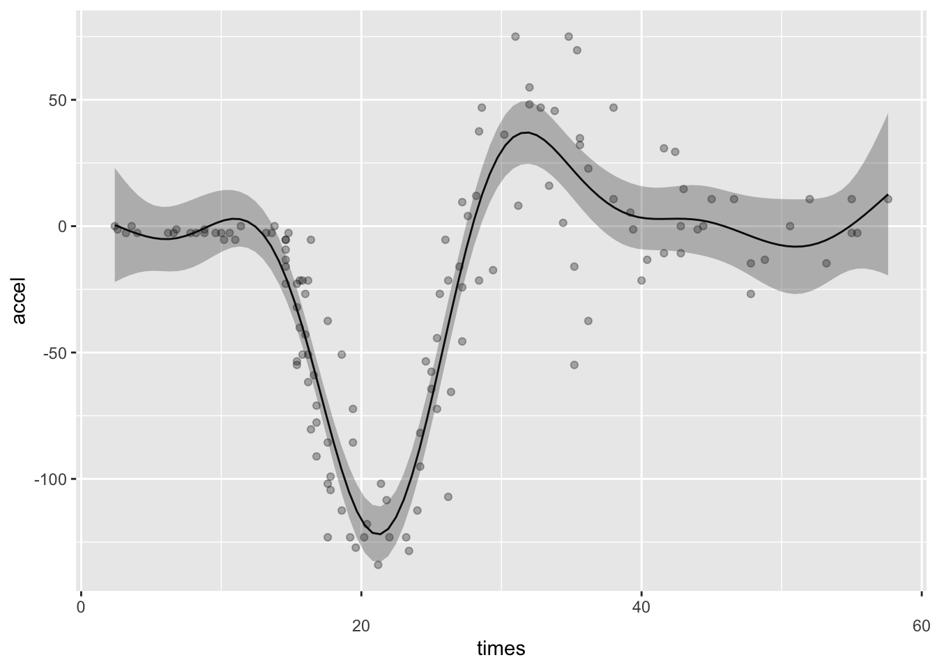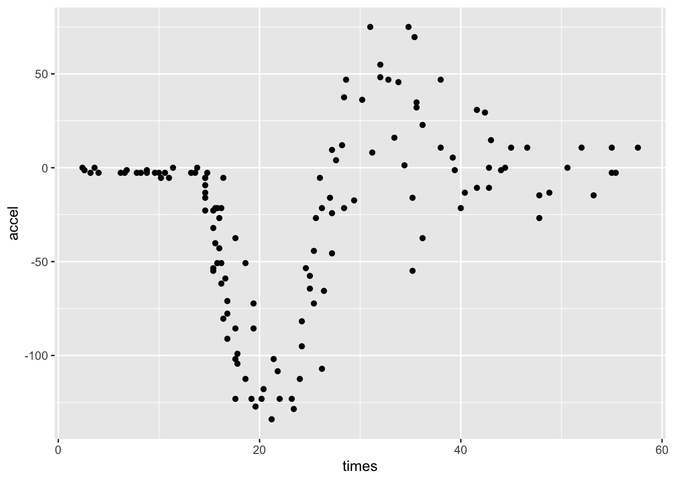 자료의 구조에서 보는 바와 같이 times는 충돌 후 시간(millisecond)이고 accel은 표준중력단위(1g= 9.806 \(m/sec^2\))로 측정된 가속도(g)이다. 시간과 가속도의 관계를 그림으로 나타내 보면 다음과 같다.