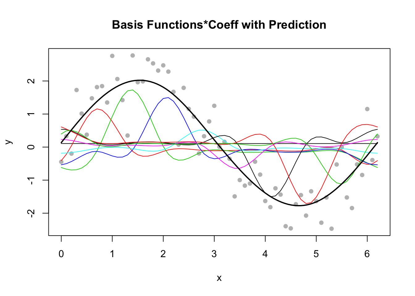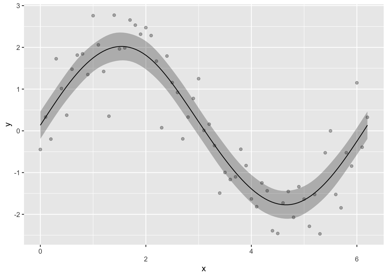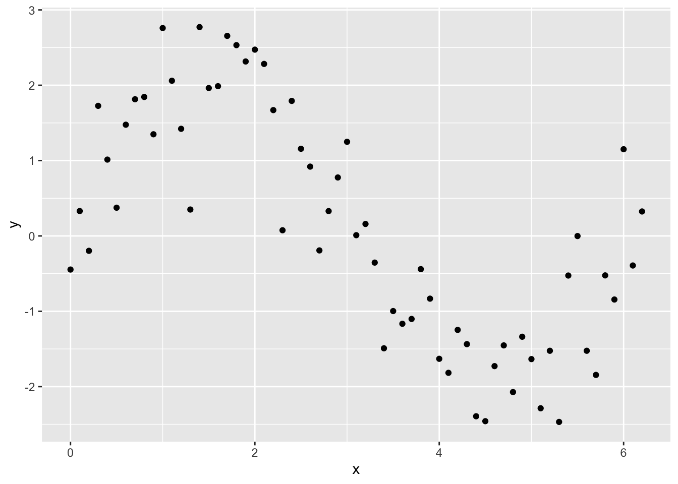 y <- 2*sin(x) + rnorm(n = length(x), mean = 0, sd = sd(2*sin(x) / 2))