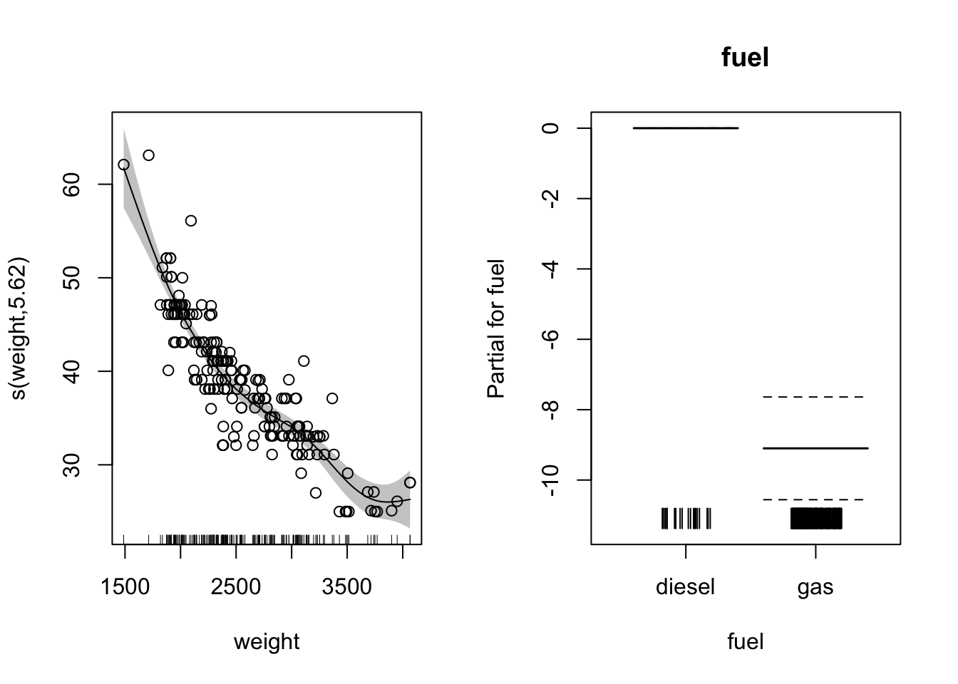 model5 <- gam(hw.mpg ~ s(weight)+fuel, data=mpg, method="REML")