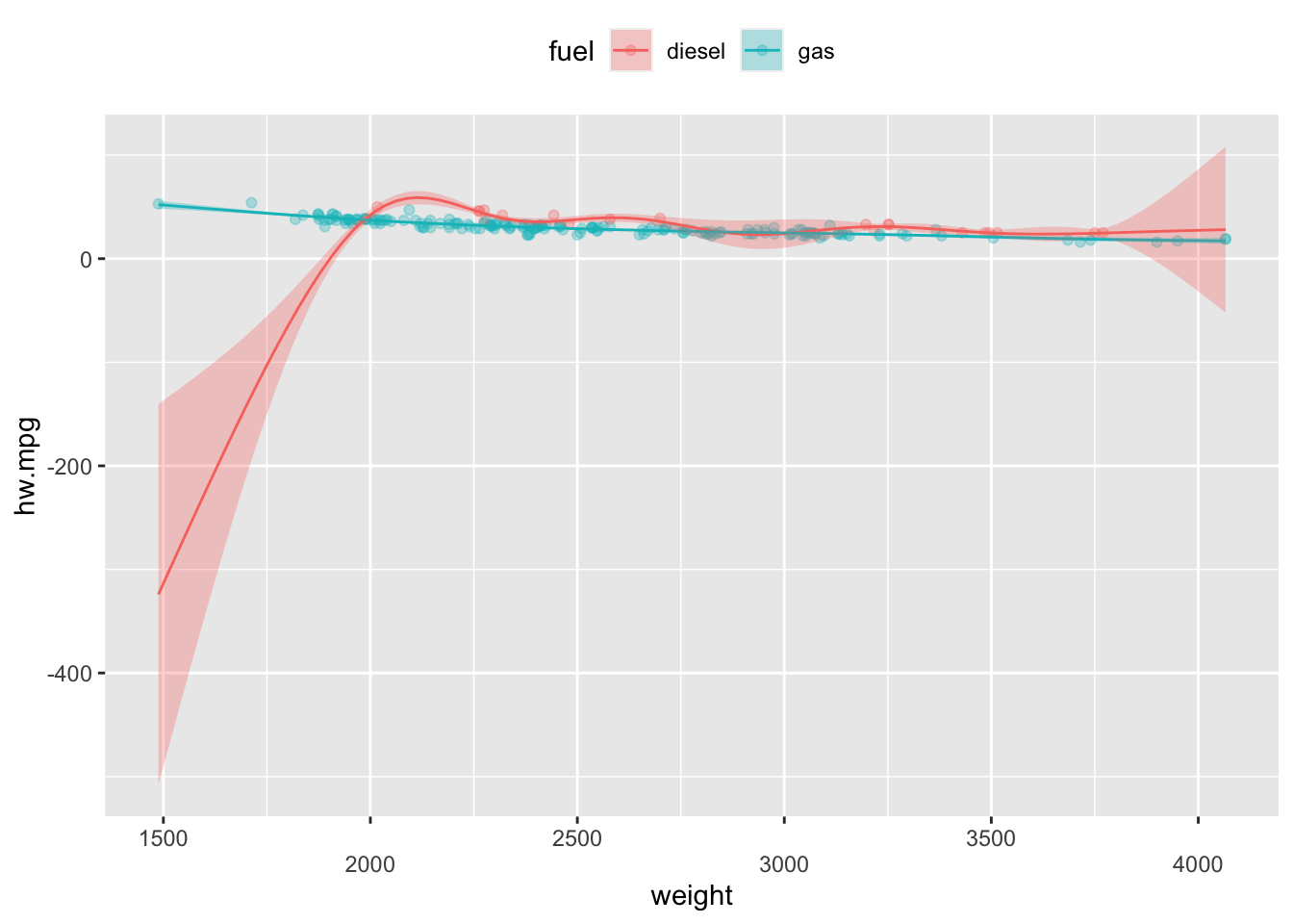 범주형 변수를 추가할 경우 선형항을 사용하면 된다. mpg 데이터의 fuel변수는 디젤유(diesel)과 가솔린(gas)의 두 개의 범주로 되어 있으며 이 변수를 선형항으로 추가할 경우 gam()함수는 각 범주에 따라 고정효과가 있는 것으로 모형을 적합시킨다. 그 결과 가솔린의 연비가 떨어지는 것을 볼 수 있다. 반대로 디젤 자동차의 연비가 보다 우수하다고 할수 있다. 이 모형에서 자동차의 무게에 의한 비선형효과는 자동차 연료의 종류에 관계 없이 같은 효과를 보인다. 이는 선형회귀모형에서 기울기의 변화 없이 절편만 달라지는 것과 마찬가지이다. 한가지 주의할 점은 범주형 변수를 사용할 때에는 반드시 factor로 사용해야 한다는 점이다. mgcv 패키지에서는 문자형 변수를 사용하지 못한다.