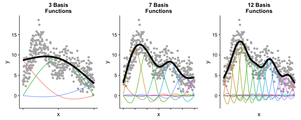 평활 파라미터 이외에도 기저함수의 갯수 또한 GAM 함수의 평활도에 영향을 미친다. 같은 데이터에 3개, 7개, 12개의 기저함수를 사용한 경우의 예는 다음과 같다.